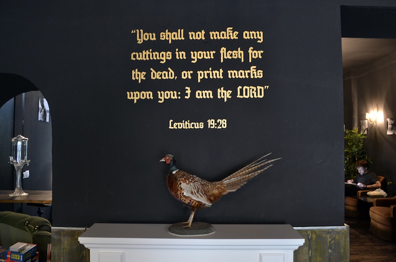 Als erstes merke ich: es ist dunkel! Die Wände sind schwarz und die Möbel sind zum größten Teil in dunklen, gedeckten Farben gehalten. Das schummerige Licht und der Holzfußboden tragen zu meinem Eindruck bei. Aufgelockert wird das Ambiente aber zum einen durch helle Farbtupfer, wie dem weißen Kamin und vor allem durch den super netten Empfang von Wahid, dem Gründer des 19:28 Tattoo Club.