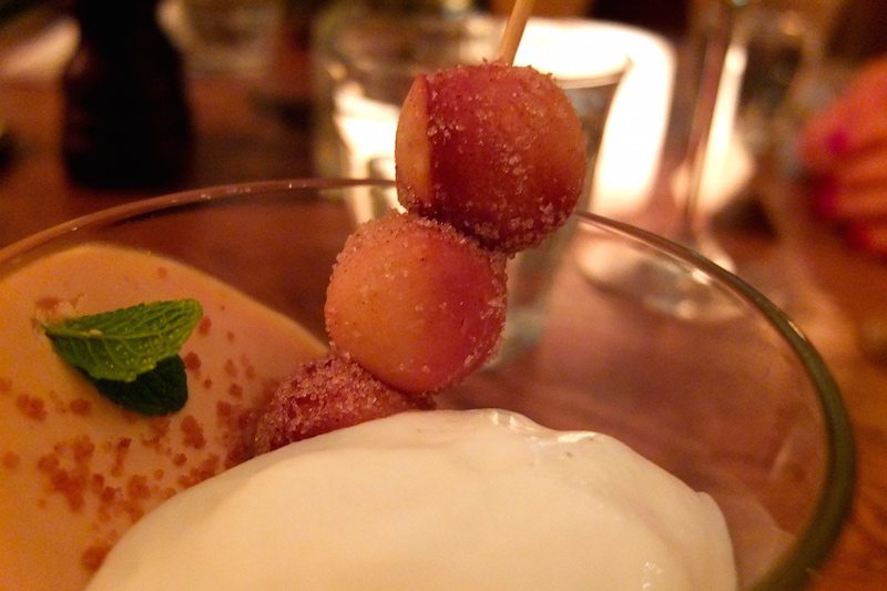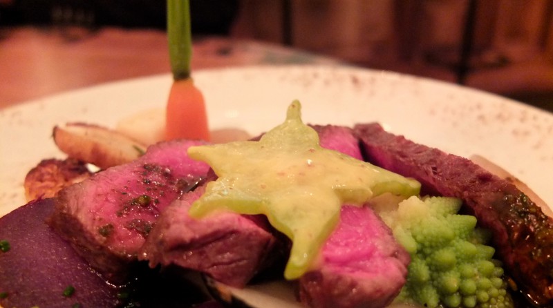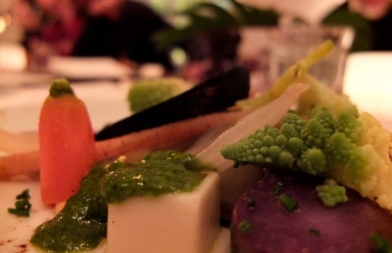 Das beste Beispiel für sein Können war eigentlich schon die Vorspeise. Zuerst lagen nur Wirsingkohl, Ziegenkäse, geräucherte Gerste und Kürbisstücke auf dem Teller, die anschließend separat mit der Butternusskürbissuppe übergossen wurden. Das faszinierende war, dass jedes einzelne Aroma auch in der Mischung erhalten blieb und sich entfaltete. Hab ich persönlich selten so intensiv erlebt. Dieses Geschmackserlebnis zog sich so auch durch die weiteren Gänge aus Gemüsevariationen, Polenta mit Lila Kartoffeln, Romanesco und Blumenkohl – und natürlich auch durch das Dessert, einer Bourbon-Vanille-Karamell-Panna-Cotta mit Bananen- und Apfelstücken und Mini-Zimt-Broiche.