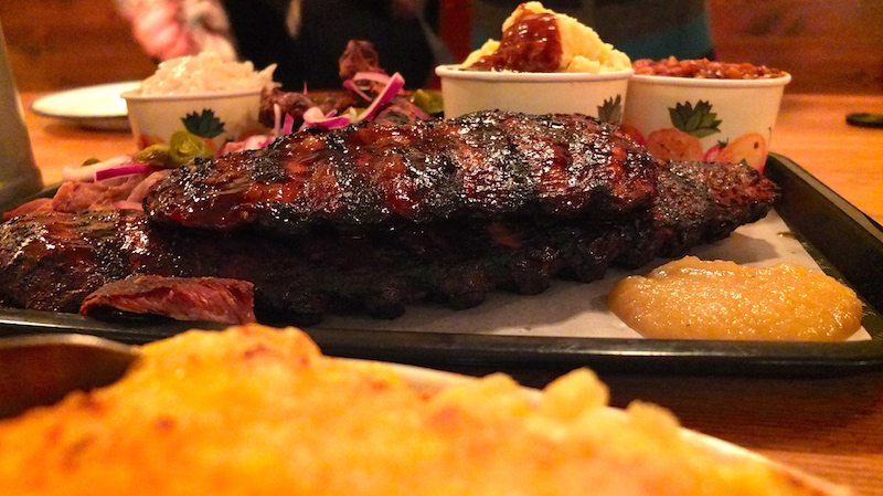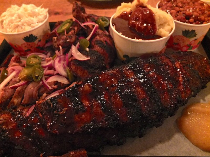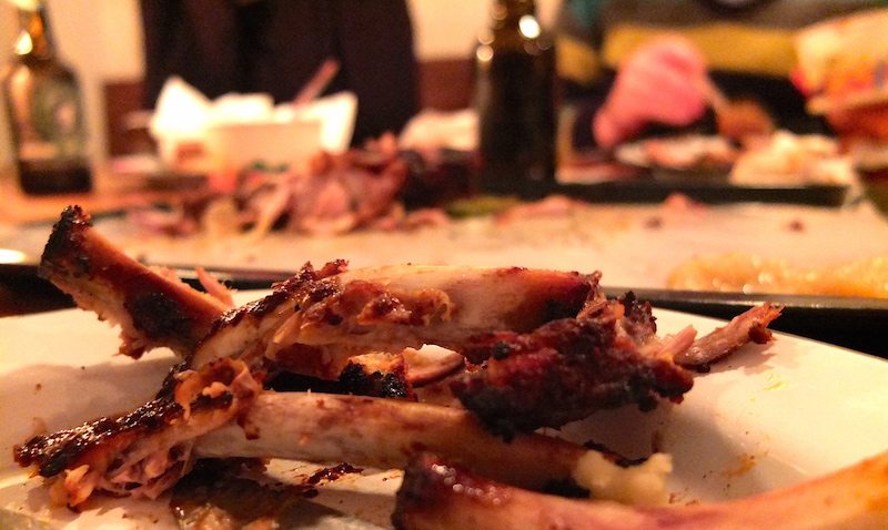 Die Karte ist zwar überschaubar, aber so ganz entscheiden konnten wir uns dann auch nicht, also nahmen wir einfach die Fleischplatte – ein Mal alles sozusagen. So ganz grundsätzlich hat man die Wahl zwischen Sandwiches, also Fleisch mit Brötchen und Fleisch pur, also Fleisch ohne Brötchen. Chichi auf den Tellern wird man vergeblich suchen, dafür darf man mit Fingern essen. Das Fleisch der Hähnchenkeule muss man nicht kompliziert mit Messer und Gabel abpulen. Selbst wer das noch gekonnt hin bekommt, spätestens bei den Rippchen, die ich am leckersten fand, sollte man das Besteck wegpacken. Es gibt einfach Essen, dass mit den Händen gegessen werden muss ;)