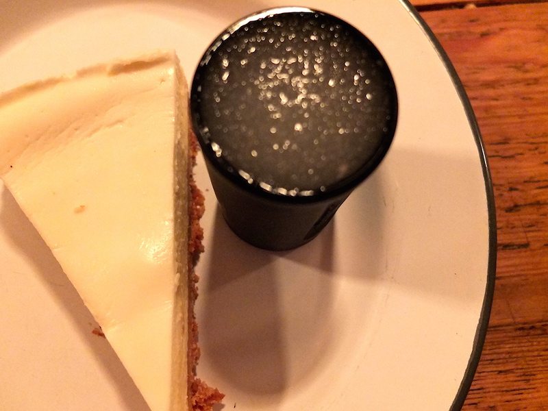 Nach so viel Herzhaftem brauchten wir am Ende noch was Süßes: New York Cheesecake, der lecker, aber tlw. fast etwas wässerig war. Für meinen Geschmack könnte der noch kompakter sein. Dazu bekamen wir noch einen Frozen Moscow Mule. Wir teilten schwesterlich, denn eine alleine hätte das wohl niemand mehr geschafft.