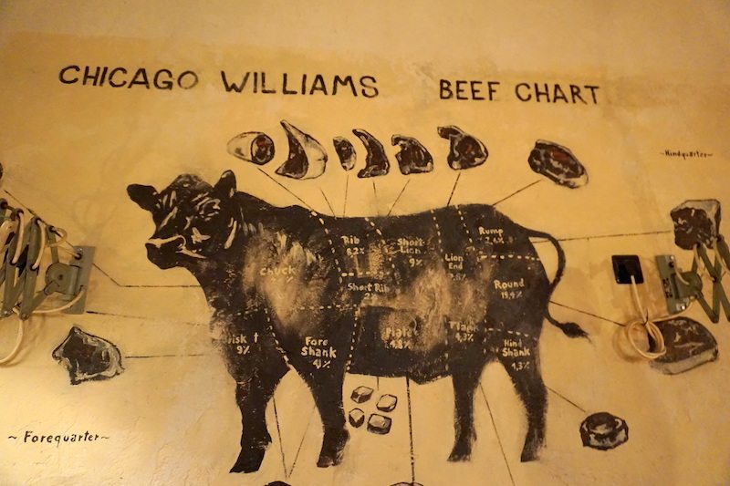 Zwar ist es recht laut, aber dafür ist der langgezogene Raum ganz cool eingerichtet. Die Wände sind mit passenden Motiven verziert. Darunter natürlich auch das Abbild einer Kuh inkl. einer Beschreibung wo welches Stück Fleisch herkommt – im Chicago Williams nennt man es dann einfach “Beef Chart”. Ansonsten sitzt ihr an langen Tischen mit 6-8 Personen. Mit weniger als 4 Personen sollte man den Laden irgendwie auch nicht betreten, sonst geht man unter.