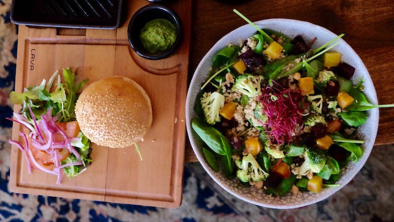 Die Speisekarte wird etwas dominiert von Burgern und Sandwiches. Die gibts klassisch mit Rindfleisch, aufgepeppt durch Varianten wie Thai (+Krautsalat) oder mit Blue Cheese, Bacon und Avocado. Wer mit Fleisch nicht viel anfangen kann, bestellt sich den Portobello (ein Riesen-Champinon) als Patty. Darüber hinaus gibt es diverse Sandwich-Kreationen mit Halloumi, Lachs, Pulled Pork & Co. Preislich starten die Burger und Sandwiches bei 7,50 EUR.