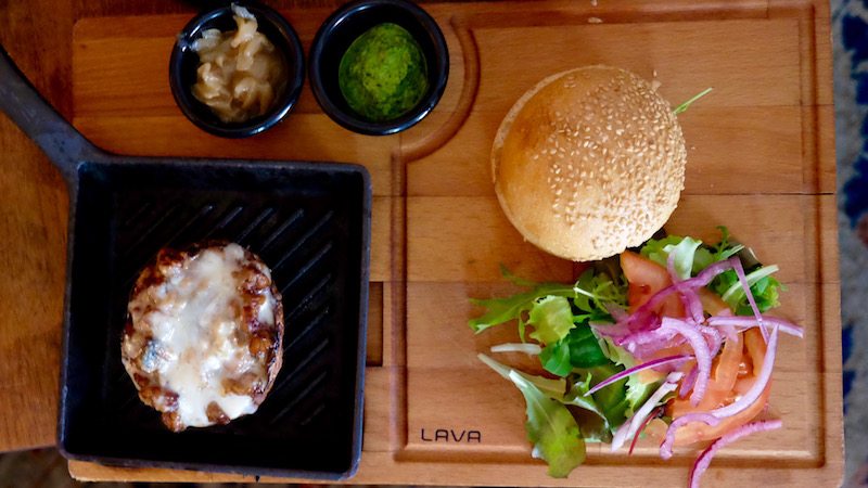 Was mir ganz gut gefällt: Die Zutaten des Burgers werden euch einzeln auf einem Holzbrett serviert. Das sieht nicht nur toll aus, sondern bietet euch die Möglichkeit euren Burger selbst zusammen zu basteln. Der Patty kommt dabei auf einer heißen Pfanne, der Rest ist drumherum drapiert.