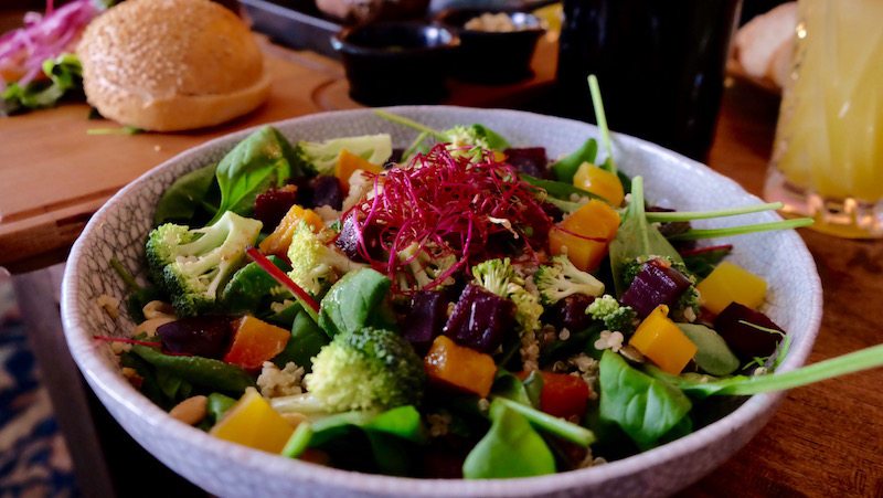 Da Burger alleine in Berlin niemanden mehr vom Hocker hauen, ist die Karte auch weitaus umfangreicher. Es gibt Suppen, frisches Brot mit Dipps und wöchentlich wechselnde Specials, wie Blumenkohl-Couscous, gebackene Paprika oder Quiche.