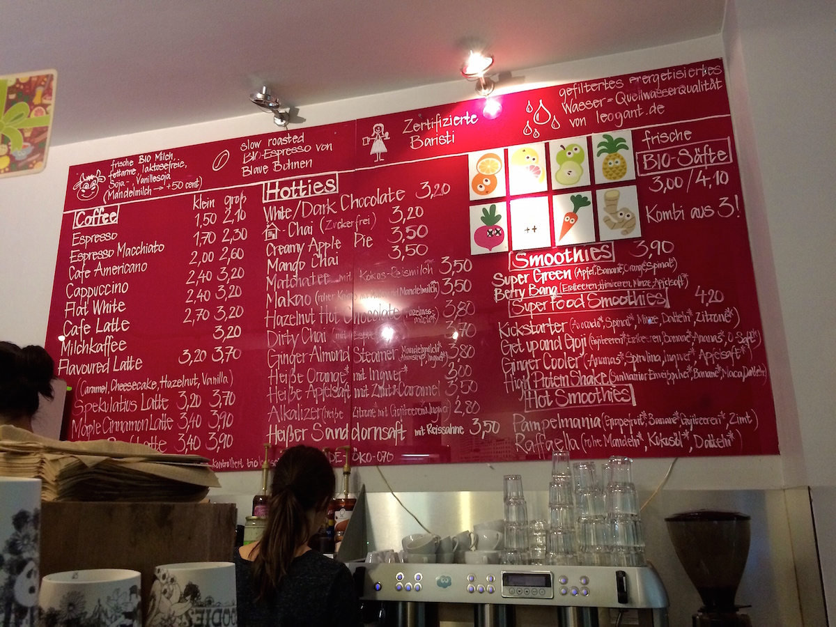 Die Getränke werden alle mit energietisiertem Wasser zubereitet (ähnlich wie beim The Juicery). Das Angebot wechselt immer mal wieder – zur kalten Jahreszeit könnt ihr euch anstatt des heißen Kakaos auch eine warme Smoothie-Variante bestellen. Die Frage, die sich mir und sicher noch ein paar anderen natürlich stellt ist, in wie weit dann noch die Nährstoffe erhalten bleiben, denn beim Erhitzen gehen die ja verloren. Vielleicht sollte man sich die Hot Smoothies auch einfach nur wegen dem Geschmack holen und den Gesundheitsaspekt mal bei Seite lassen.