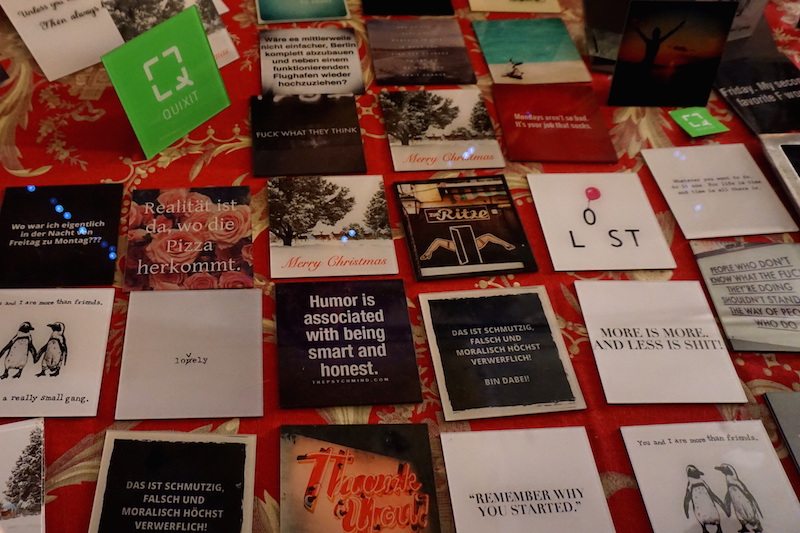 Unser absoluter Lieblingsstand war Quixit. Die beiden Gründer stehen noch selbst am Verkaufstisch und stellen ihr Magnete zur Schau. Laaaaaaangweilig? Keines wegs! Das sind besondere Magnete mit einer Acrylplatte vorne drauf, was das ganze an sich schon sehr hochwertig erscheinen lässt. Dann sind die Quixit-Magneten auch etwas größer als man es so kennt und, weil die beiden mal weiter gedacht haben, gibt es dazu noch einen Ständer für hinten, damit man die Magnete auch anhängen oder aufstellen kann. Super gut!